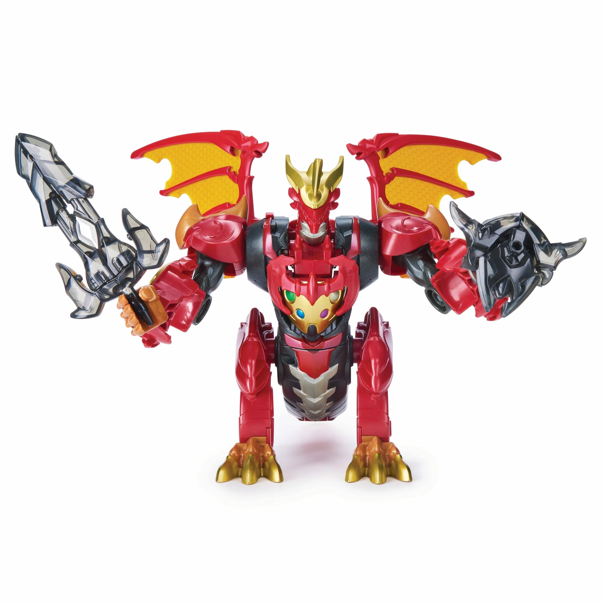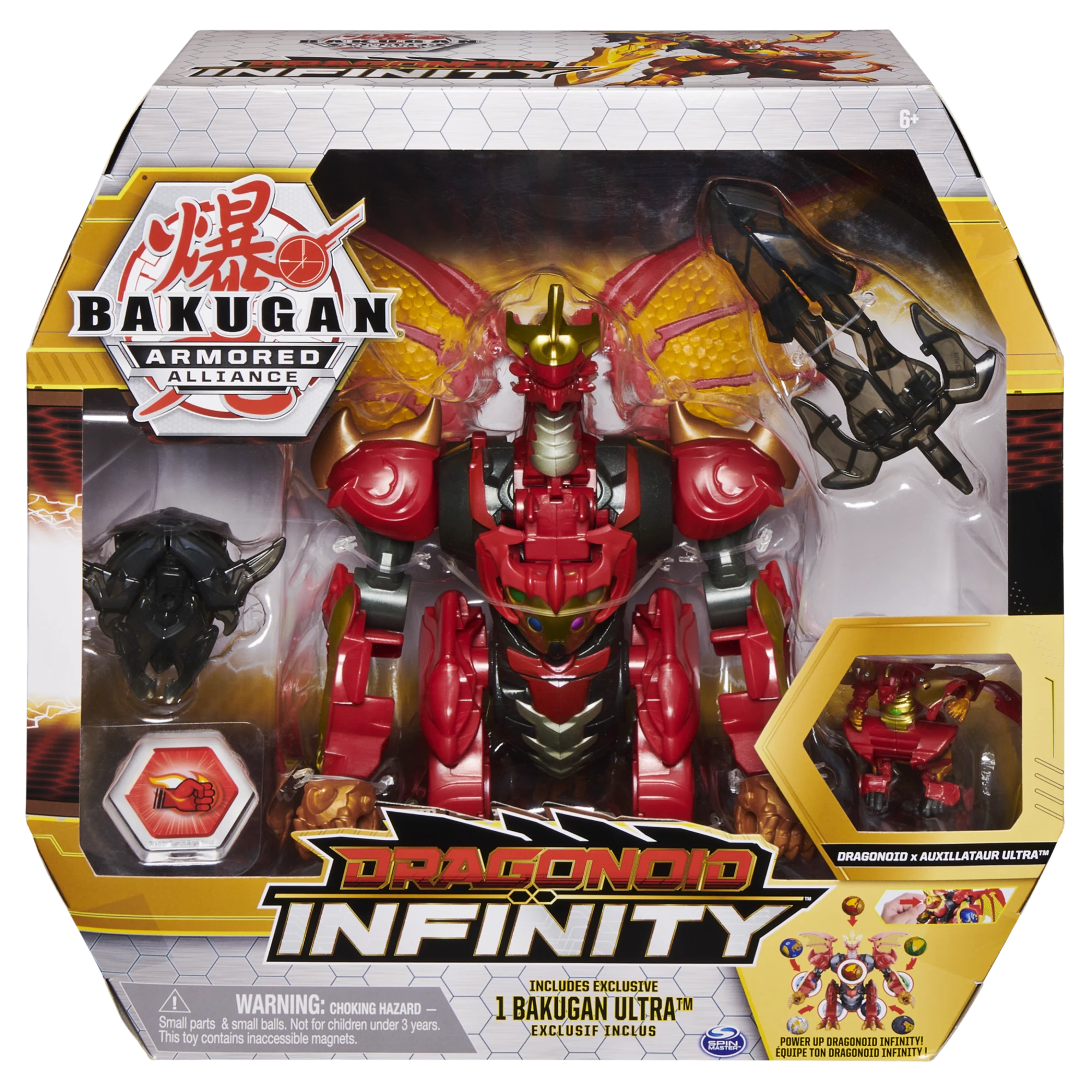 Unleash the power of fusion with Bakugan Dragonoid Infinity! This large-scale action figure is the most powerful Dragonoid yet, featuring awesome details like a chest launcher, 10 pieces of exclusive Baku-Gear and an exclusive fused Dragonoid x Auxillataur Bakugan Ultra that you wont find anywhere else. Faction Fusion bakugan toys combine two factions to create all-new, even more powerful characters for you to collect! These fused Bakugan toy figures have colors from both factions for an awesome look. Dragonoid Infinity has room to hold up to five Bakugan action figures from your collection (sold separately)! Load a Bakugan into each of Dragonoid Infinitys arms and legs and insert your Dragonoid x Auxillataur into the chest to make Dragonoid Infinitys head and wings transform! Powered up and ready for battle, Dragonoid Infinity is a force to be reckoned with. Press the button behind Dragonoid Infinitys head to launch your fused Bakugan Ultra into action, rolling over the BakuCores (two included) and leaping open in an epic transformation! Weaponize your Bakugan for battle with the Baku-Gear or assemble the pieces together and arm Dragonoid Infinity with a sword and shield. You can also combine the Baku-Gear to create the ultra-powerful Infinity Blaster! With Dragonoid Infinity as part of your Bakugan collection, take your battles to the next level. Discover infinite ways to play with Bakugan Dragonoid Infinity!