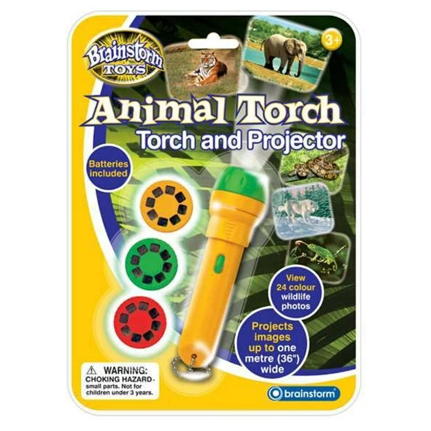 This handy torch is also a photo projector that projects images up to one meter wide onto walls and ceilings, turn the lens head to focus the images! Includes 24 color wildlife photographs, on three changeable slide disks.