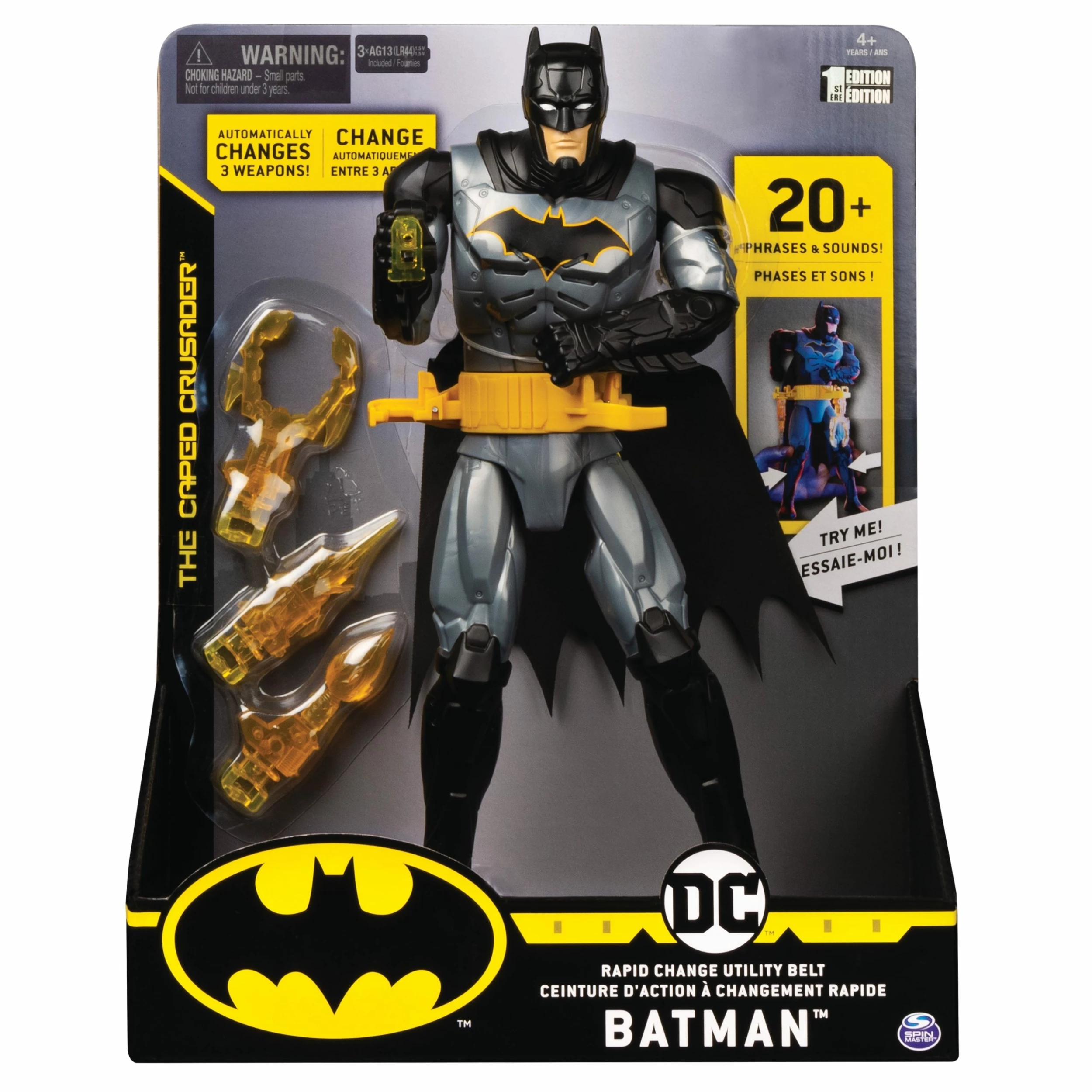 Get ready for combat with the 12-Inch BATMAN Rapid Change Utility Belt Action Figure! This CAPED CRUSADER deluxe action figure comes packed with epic features. With a rapidly rotating weapon change tool belt, weapons that light up and over 20 phrases and sounds, this BATMAN action figure toy can handle any mission! Slide the included Bat Claw, Bat Torch and Bat Blaster weapons into the utility belt, and squeeze BATMAN’S legs to automatically change a weapon. His belt rotates, activating the sound effects, lighting up the weapon as it’s pulled from the utility belt! Not the right tool for combat? No problem! Simply squeeze BATMAN’S legs to automatically return the weapon into the utility belt, then squeeze once again to draw a new weapon! Featuring a highly detailed sculpt, cloth cape and three points of articulation, pose your BATMAN figure. Switch weapons again and again and bring the action of BATMAN to life with the 12-Inch BATMAN Rapid Change Utility Belt Action Figure!