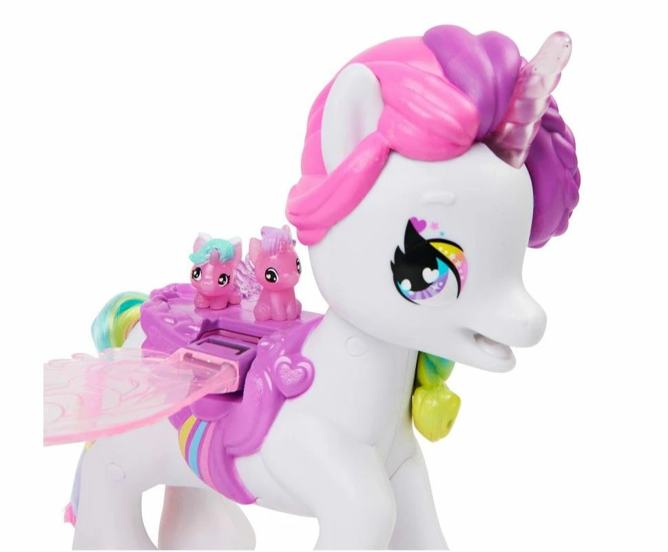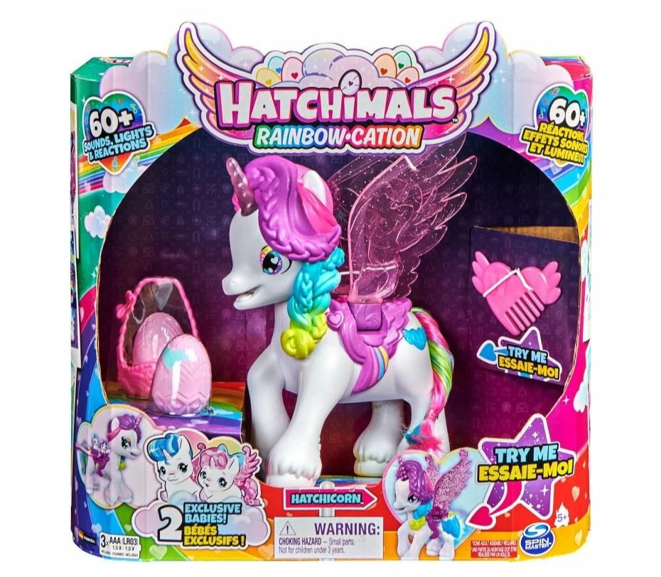 INTERACTIVE TOY UNICORN: Adventure through the sky! Hatchicorn has over 60 lights and sounds, flapping glittery wings, a rainbow tail you can brush with her comb, 2 exclusive Twin Babies and a basket they can ride in!
