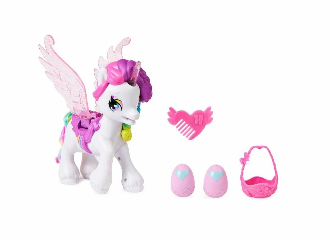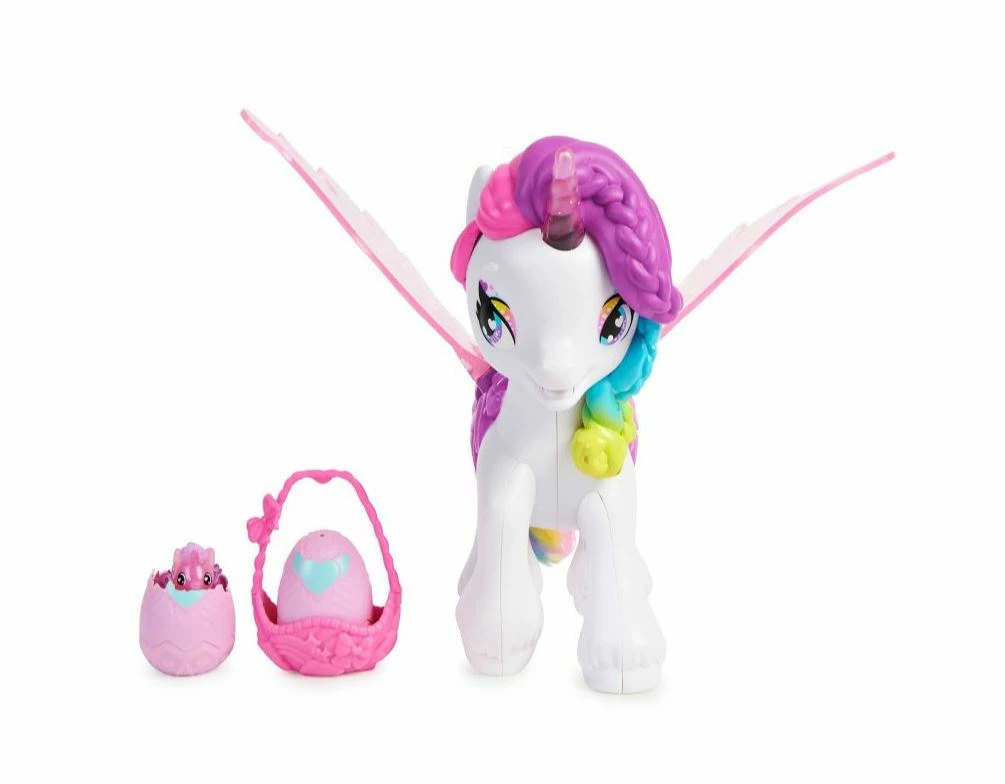 Includes: 1 Hatchimals Interactive Unicorn, 2 Hatchimals CollEGGtibles, 1 Basket, 1 Comb, 1 Instruction Sheet