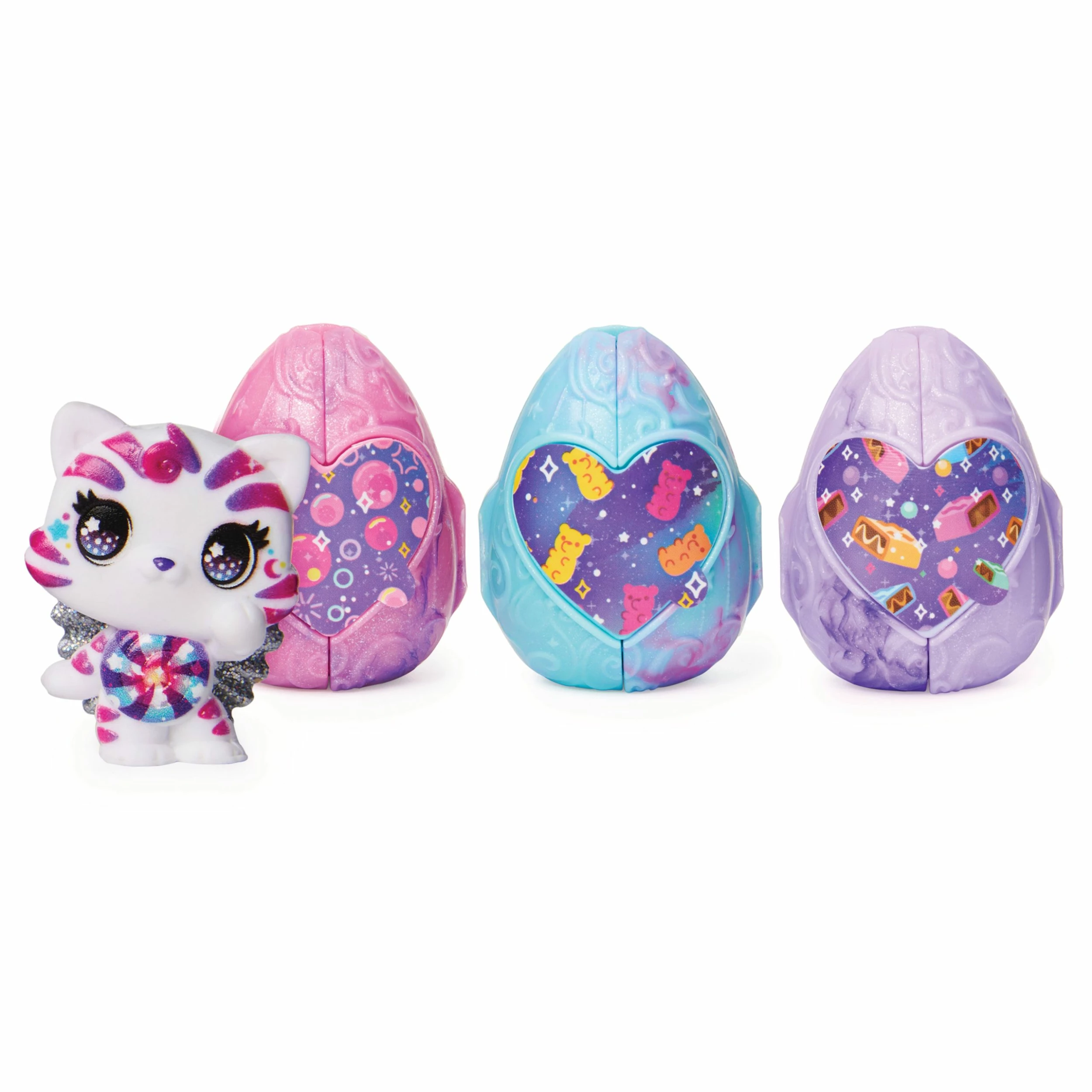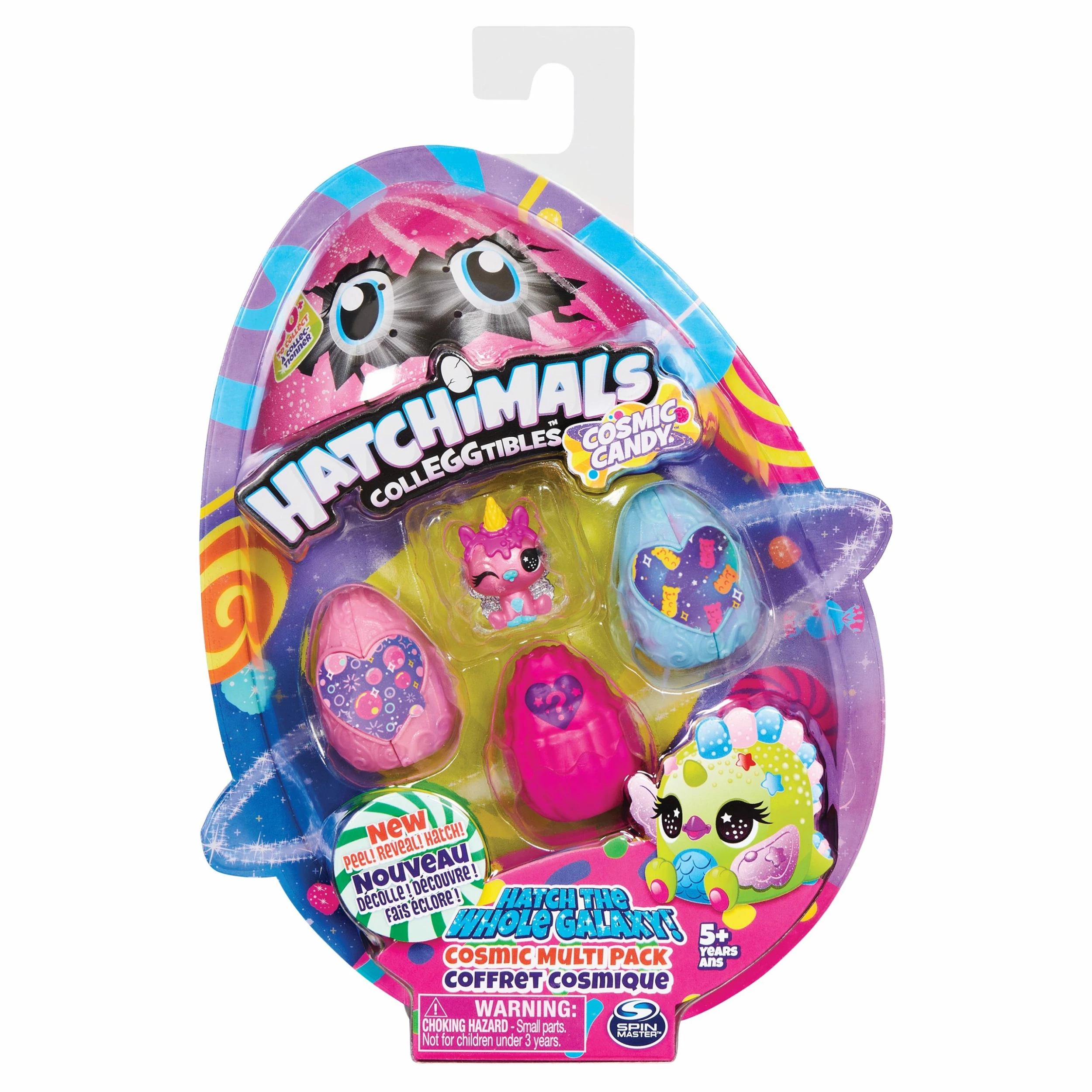 Discover a galaxy of Hatchimals CollEGGtibles with the Cosmic Candy Multipack! Part cosmic, part candy, these adorable characters have a unique look and style! There are 12 Cosmic Candy mystery features to discover, including gummy, fuzzy, patterned, glow-in-the-dark and more! Plus, there’s even more surprises with every Cosmic Candy character: a whole new hatch and a reusable egg! Inside the Cosmic Multipack, you’ll find three characters in-egg and one out-of-egg, ready to play! To start hatching, peel off the heart sticker on one of the reusable eggs to reveal a symbol hinting at your character’s feature. Hatch the heart to get a sneak peek at your character, then open up each side of the egg to meet your Cosmic Candy cutie! Hatch Gummy Draggle with a squishy body and gumdrop spikes; Chilly Unikeet with an upside-down ice cream cone horn; Peppermint Zebrush that looks like a wrapped-up mint and more! Every Cosmic Candy character is a treat to collect! Will you find one of the ultra-rare Sprinkle Sun characters filled with colorful sprinkles, or a limited-edition stackable Treat Trio? There’s even a chance you could find a classic egg to hatch! With over 50 Cosmic Candy CollEGGtibles and eight Cosmic Candy Pixies (each sold separately) to hatch and collect, add them all to your collection! When you’re finished hatching, the eggs become displays for your new friends! On your checklist, you’ll also get a Hatchtopia Life code to use in the free app (compatible with iOS and Android devices). Bring home Cosmic Candy fun with the Hatchimals CollEGGtibles Cosmic Multipack!