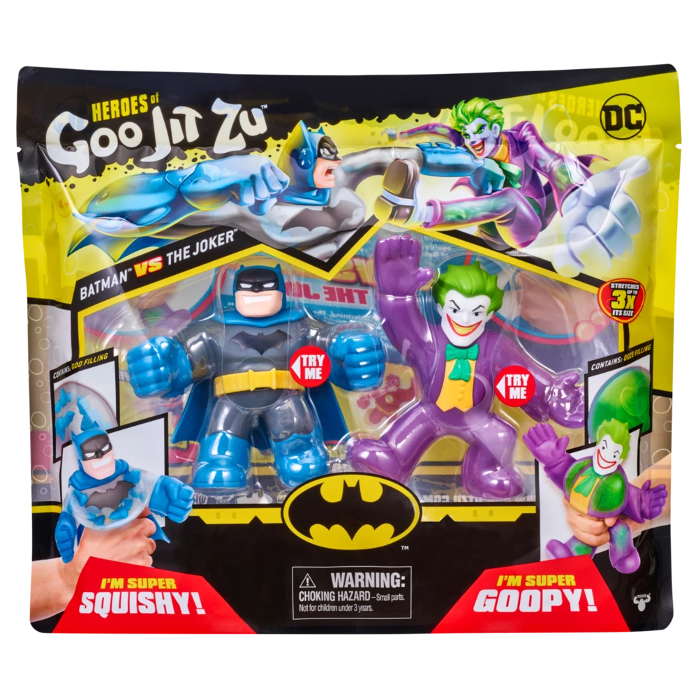 The Versus Pack contains one super squishy Exclusive Batman Goo Jit Zu figure with an amazing bat filling and one super goopy Exclusive Joker Goo Jit Zu figure with an awesome green swirly ooze filling. Battle them together like you have never seen before! Super durable, their stretchy bodies can stretch up to 3 times their size and then return to their original shape and size! Discover a new way to play and save the day with these cool collectible toys!