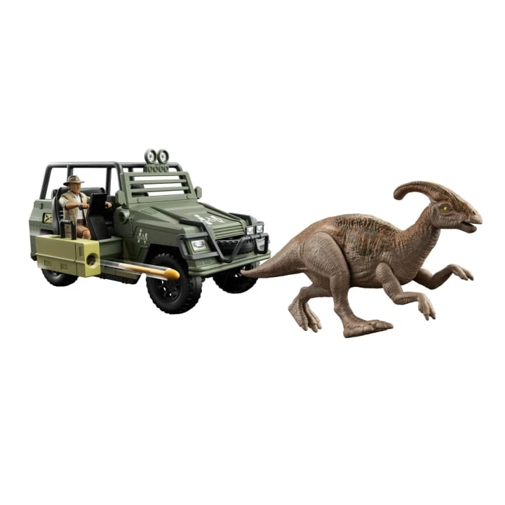 The adventure starts roaring right out of the box with this action filled pack which includes a detailed off-road vehicle with projectiles, a Parasaurolophus dinosaur figure and a Roland Tembo figure.