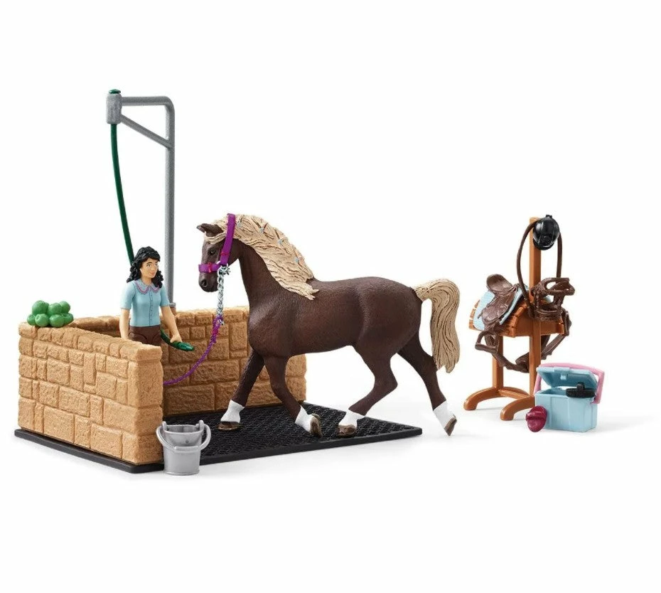 At the Washing Area with Horse Club Emily & Luna from Schleich Horse Club, Emily washes her Holsteiner mare, Luna, after training, and is happy to have the practical saddle stand.