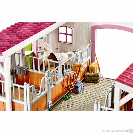 The new Schleich stable building is ready. With its green doors and pink windows, it looks simply incredible. Lissi and the other girls can’t wait. The horses are in big stalls. They have bales of straw and feed, but they all want to ride out first. The girls were allowed to help design this stable building. That’s why it turned out so incredibly beautiful.