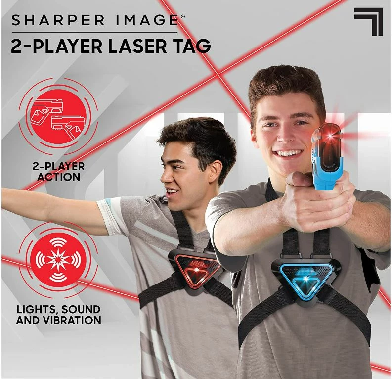 2-player set electronic laser tag. Aim for the chest target and claim your victory after 6 strikes. 2 infrared blasters. Lights, vibration and sound effects. Laser beam image is simulated.