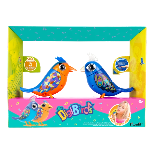 Digibirds are interactive birds which are able to tweet when you pat them, sing when you whistle to them, and when you talk it will respond to you! When Digibirds are put near one another they magically connect via MAGICTUNES technology, sing and move like a choir. Digi-Clip is included for you to carry them around.