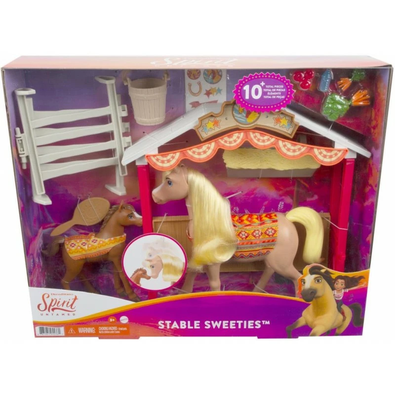 Each horse also comes with a colourful horse blanket. Accessories include a paddock with canopy and two fence panels for corralling the horses, a feeding basket, 2 carrot bunches, apples, a bottle, sticker sheet and a brush for grooming. Kids will love playing out favorite movie scenes and caring for horses with the Stable Sweeties playset.