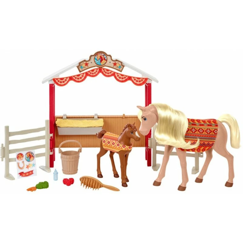 With the Stable Sweeties playset, kids can learn how to care for and feed horses with fun storytelling pieces. Playset includes one horse (approx. 20.32cm) with a long beautiful mane and movable head for nuzzling moments and a foal horse (approx. 12.7cm).