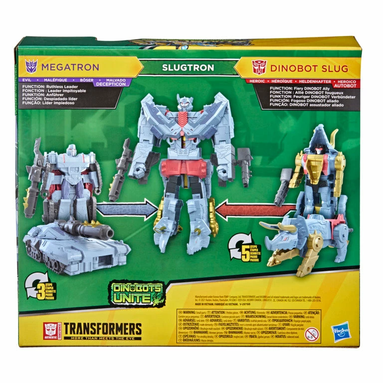 Create the ultimate Dinobot team-up with Dino Combiners figures! This pack comes with 2 figures that combine to form the 7-inch Slugtron toy! Combine the Megatron and Dinobot Slug figures in 11 steps. Convert Megatron figure from tank to robot mode in 3 steps and Dinobot Slug figure from triceratops to robot mode in 5 steps. Comes with a fusion cannon and blaster accessories.