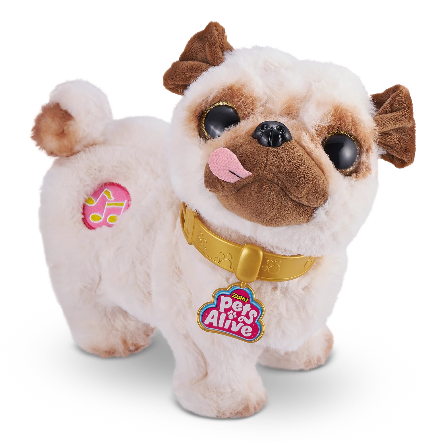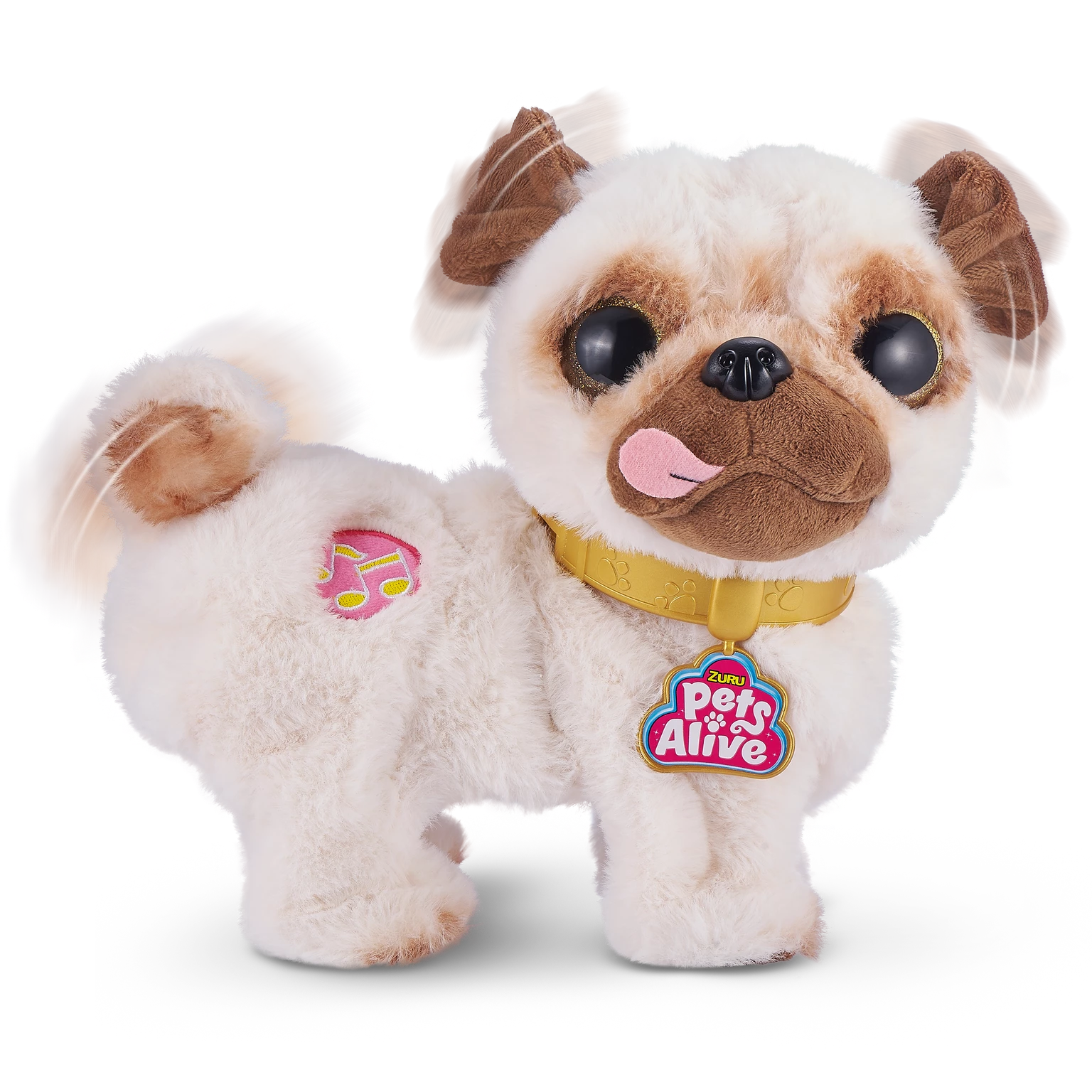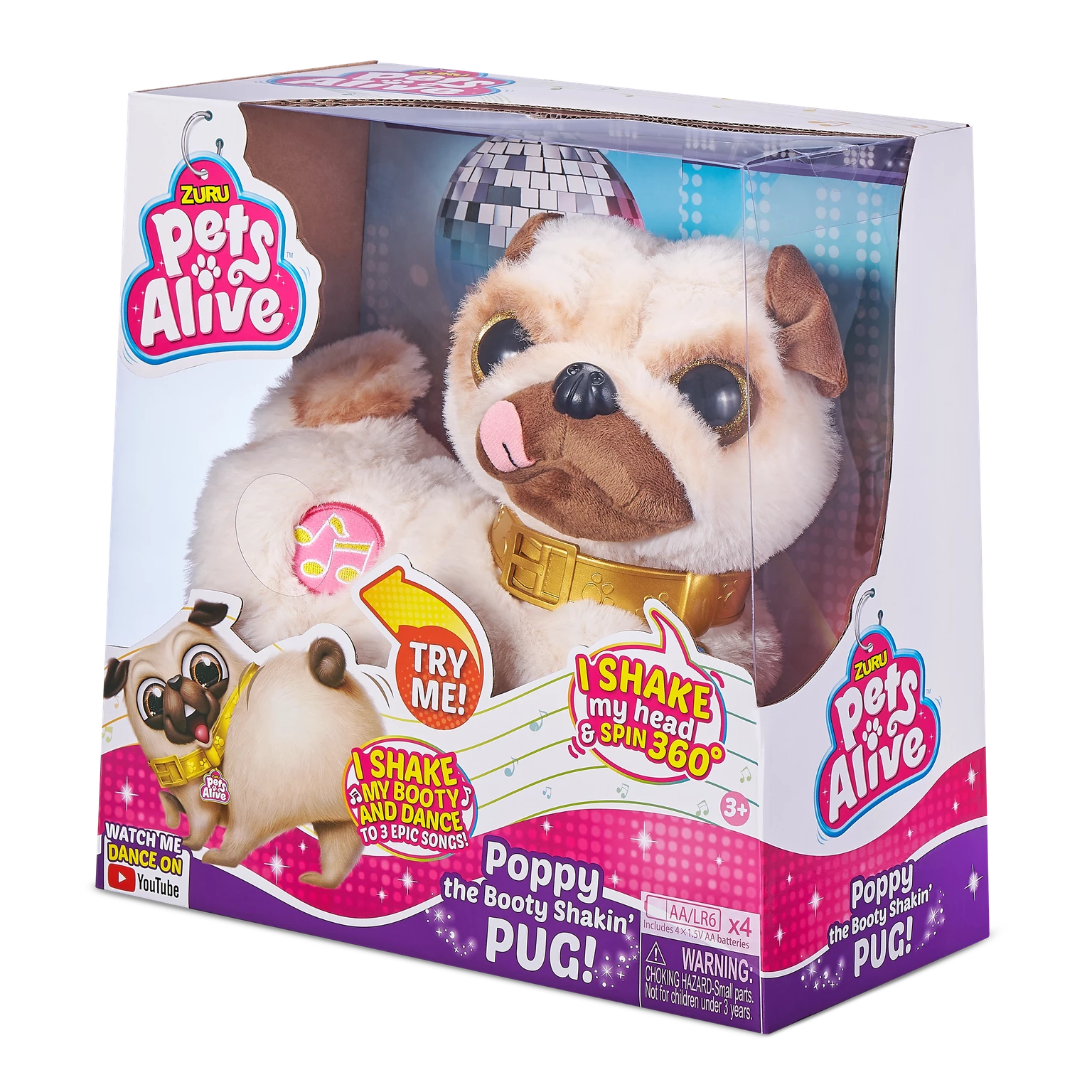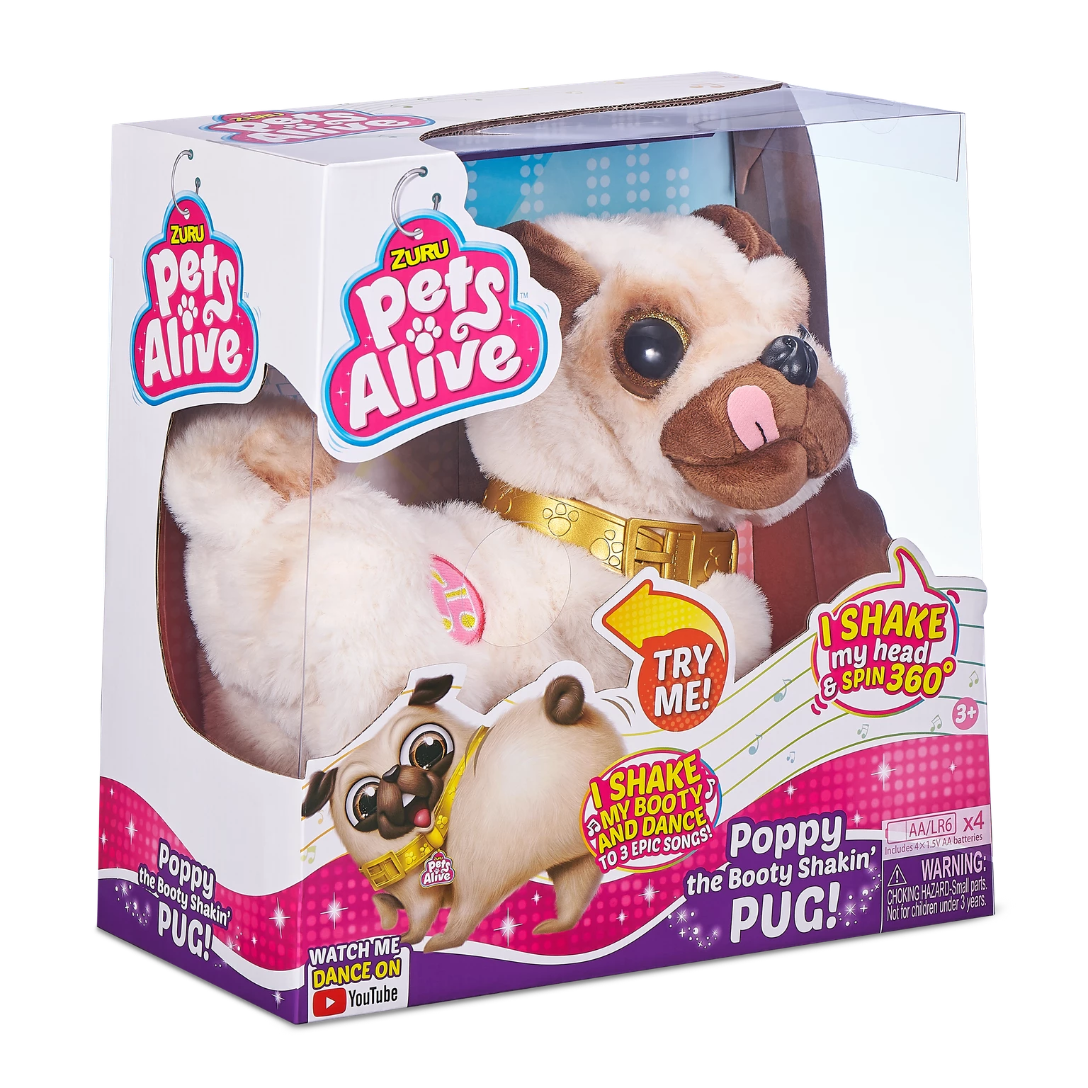 This Pug loves to Dance! Meet Pets Alive Poppy the Booty Shakin’ Pug whose got hilarious moves and can groove dance twirl and shake her booty to 3 fun songs! Press Poppys music note and watch as she comes alive with her head twirling 360 spins and booty shakin. With her cute realistic design and contagious energy it’s impossible for the whole family to not get up and dance with Poppy!